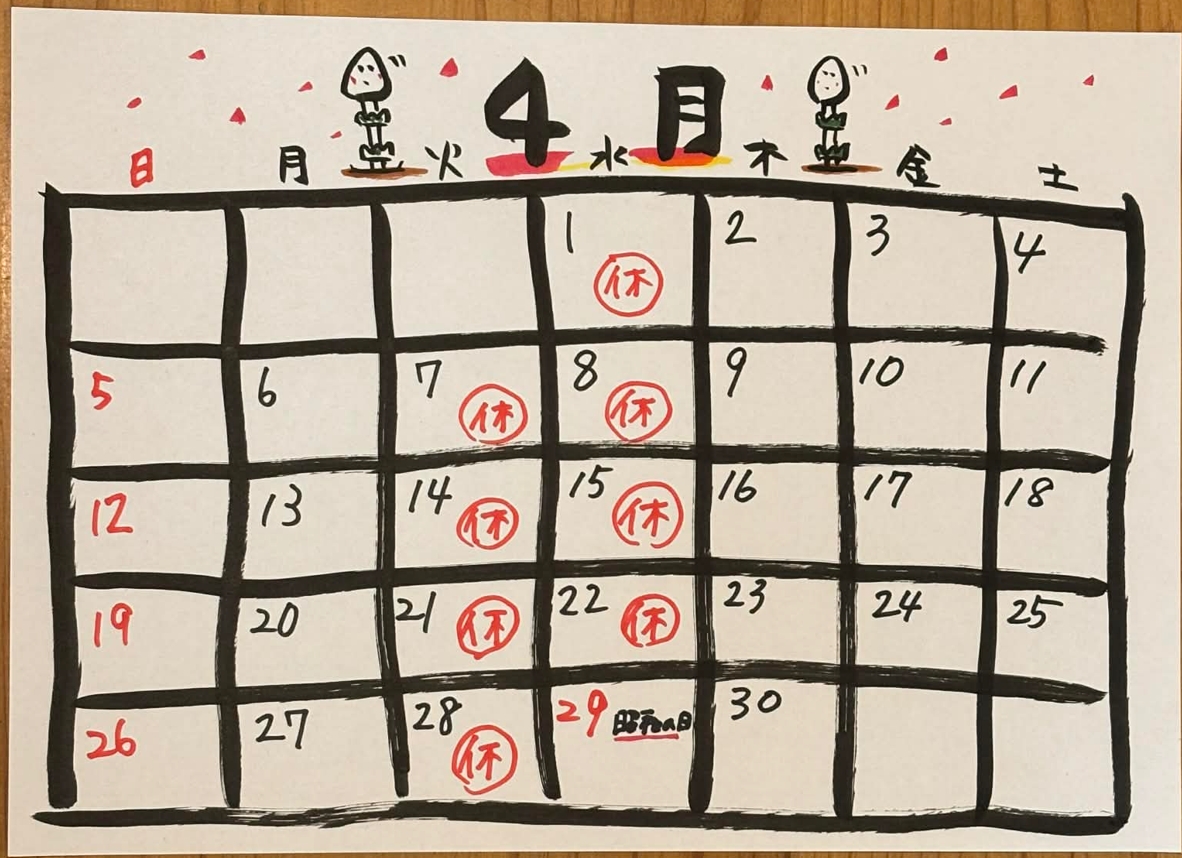 4月は火曜日水曜日がお休みです。わかりやすいです(笑)
